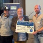 Dott. Antonio Bossi, organizzatore PharmaDay, consegna l’assegno di beneficenza a Gianpaolo Conelli, direttore della Fondazione Amilcare in compagnia di Alessandro Maraniello, testimonial.