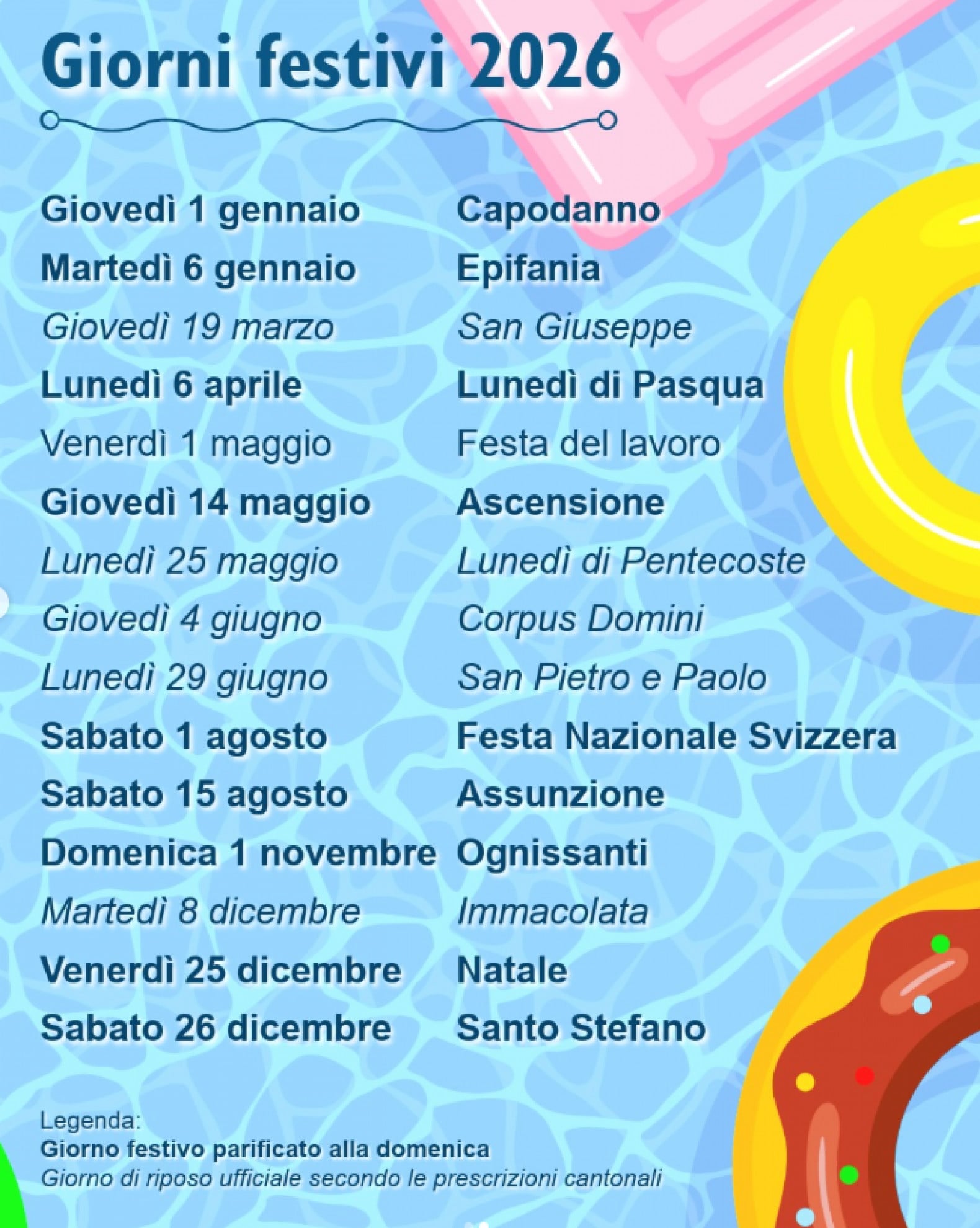 Nella foto, il riepilogo grafico di tutti i giorni festivi del 2026, con la distinzione fra i giorni festivi parificati alla domenica (per le aziende sottoposte alla legge federale sul lavoro (LL) sono applicabili, in tali giorni, le prescrizioni per il lavoro domenicale secondo gli art. 18 e 19) e i giorni di riposo ufficiale secondo le prescrizioni cantonali (non sono applicabili le disposizioni della legge federale sul lavoro per il lavoro domenicale).