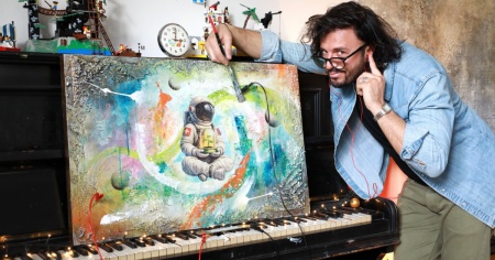 Quell'esibizione in redazione – Tra l'autunno del 2019 e l'inizio del 2020 questo bizzarro personaggio aveva visitato la sede di tio.ch. Facendoci capire che cosa è un live painter. E realizzando un quadro che ancora oggi è esposto in redazione. Poco tempo dopo è scoppiata la pandemia da Covid-19. E quindi la visita la ricambiamo un po' in ritardo. Scoprendo che nel frattempo il "ragazzo", oggi 41enne, si è evoluto. «Continuo a lavorare per vari marchi che mi chiedono di ideare qualcosa di originale per loro», ammette nel video che abbiamo realizzato nel suo regno.