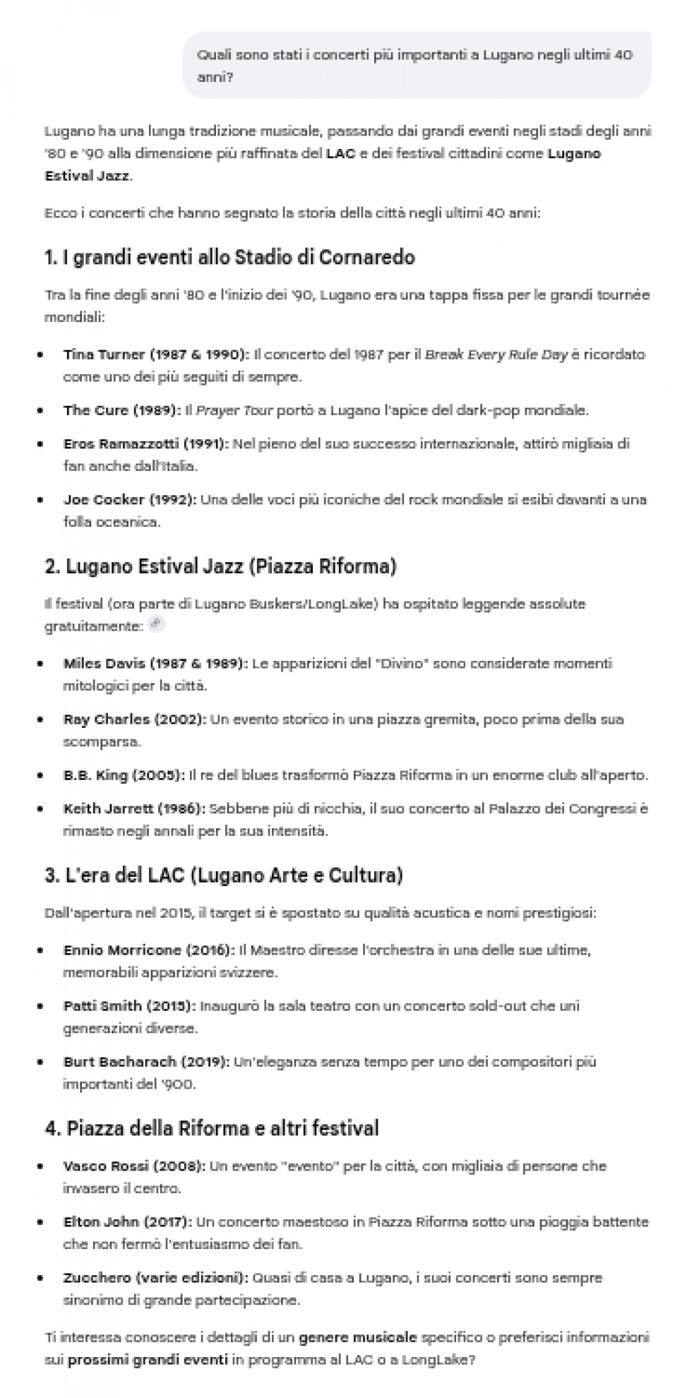 GeminiLa risposta alla domanda: «Quali sono stati i concerti più importanti a Lugano degli ultimi 40 anni?»Locarno, non Lugano - Gli appuntamenti (con breve descrizione annessa) sono stati inseriti in un lungo elenco fornito da Gemini, in risposta a una nostra semplice domanda: «Quali sono stati i concerti più importanti a Lugano negli ultimi 40 anni?». Gli errori, come si capisce nei due casi citati, non sono mancati. Per esempio, il celebre cantautore italiano si esibì a Locarno e non sul Ceresio (a Lugano tenne un concerto nel 1996). Mentre non risulta alcun live del “baronetto” del pop.