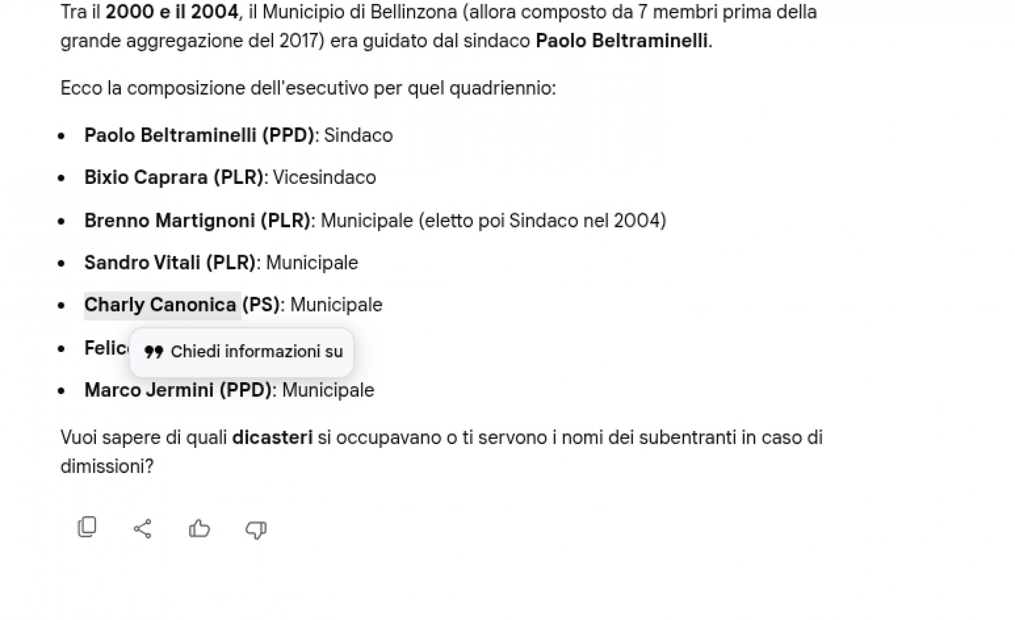 GeminiI municipali di Bellinzona dal 2000 al 2004 secondo GeminiI municipali (errati) di Bellinzona - Le sviste, però, non riguardano solo l’ambito musicale. Abbiamo chiesto, sempre all’intelligenza artificiale di Google, di dirci chi erano i municipali di Bellinzona dal 2000 al 2004. La risposta, anche in questo caso, lascia molto a desiderare. Per esempio, viene indicato come sindaco l’ex consigliere di Stato Paolo Beltraminelli (che in realtà in quel periodo era municipale di Pregassona). Viene poi indicato, per esempio, come vicesindaco, Bixio Caprara (l'attuale granconsigliere PLR si candidò però per il consiglio comunale).