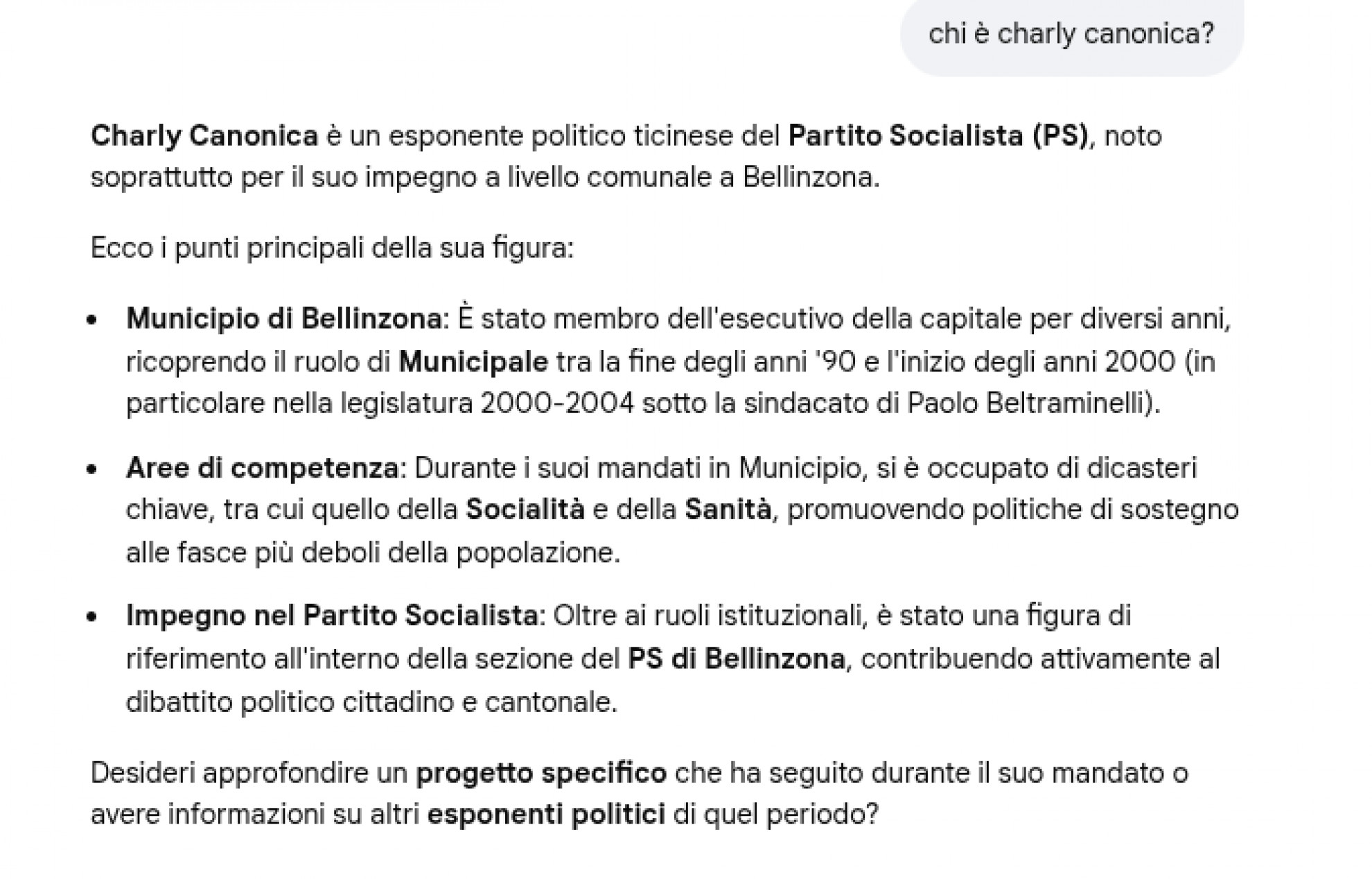 Chi è Charly Canonica? - Charly Canonica, secondo Gemini esponente PS, «è stato membro dell’esecutivo della capitale per diversi anni, ricoprendo il ruolo di Municipale tra la fine degli anni Novanta e l’inizio degli anni duemila sotto la sindacatura di Paolo Beltraminelli». Nella tornata elettorale del 2000, non risulta nessun candidato con quel nome. Né esiste una figura con quel nome e quegli incarichi. In generale, l’unico municipale azzeccato, nell’elenco, è stato Brenno Martignoni.