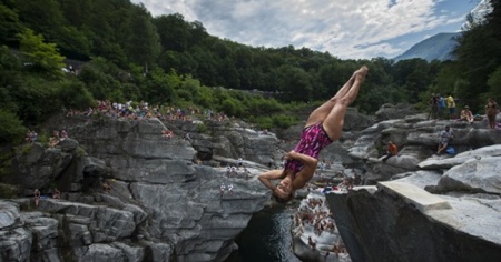 PONTE BROLLA - Si è svolto sabato pomeriggio a Ponte Brolla la quindicesima edizione dei Campionati europei di tuffi da grandi altezze. Nella magnifica cornice di Ponte Brolla, dove il fiume si insinua fra enormi massi di pietre i migliori 19 atleti europei, tra cui quattro donne, si sono esibiti in tuffi mozzafiato e in perfette acrobazie volanti. Tuffi che durano appena due secondi e mezzo, con corpi che entrano nell'acqua a 80 km/orari.